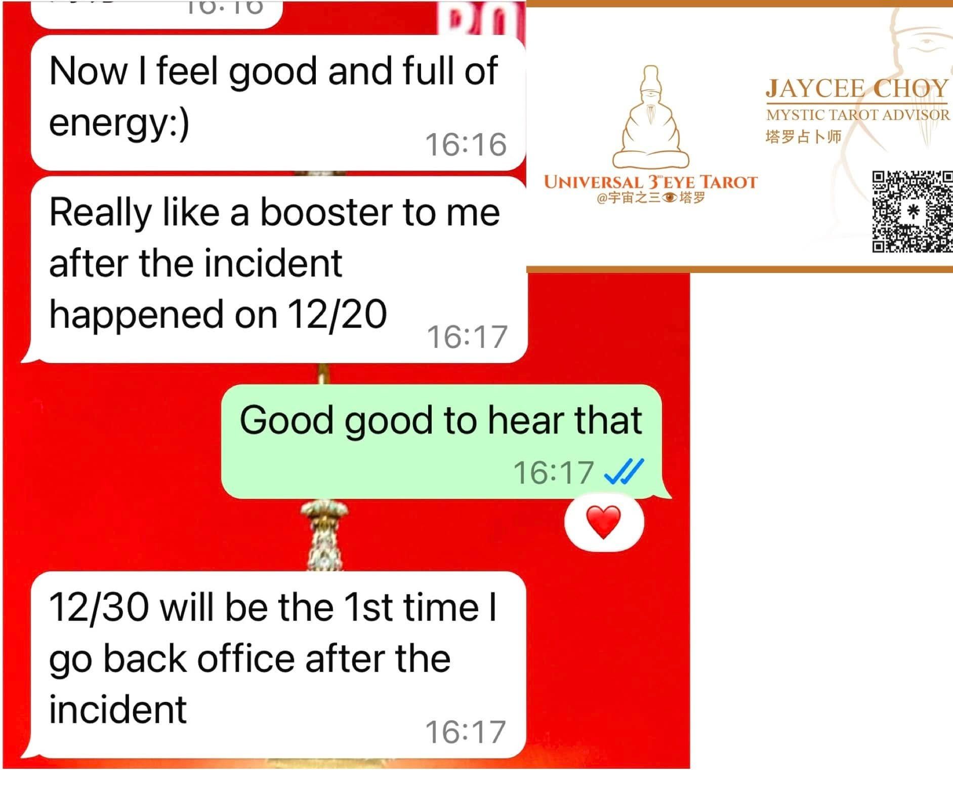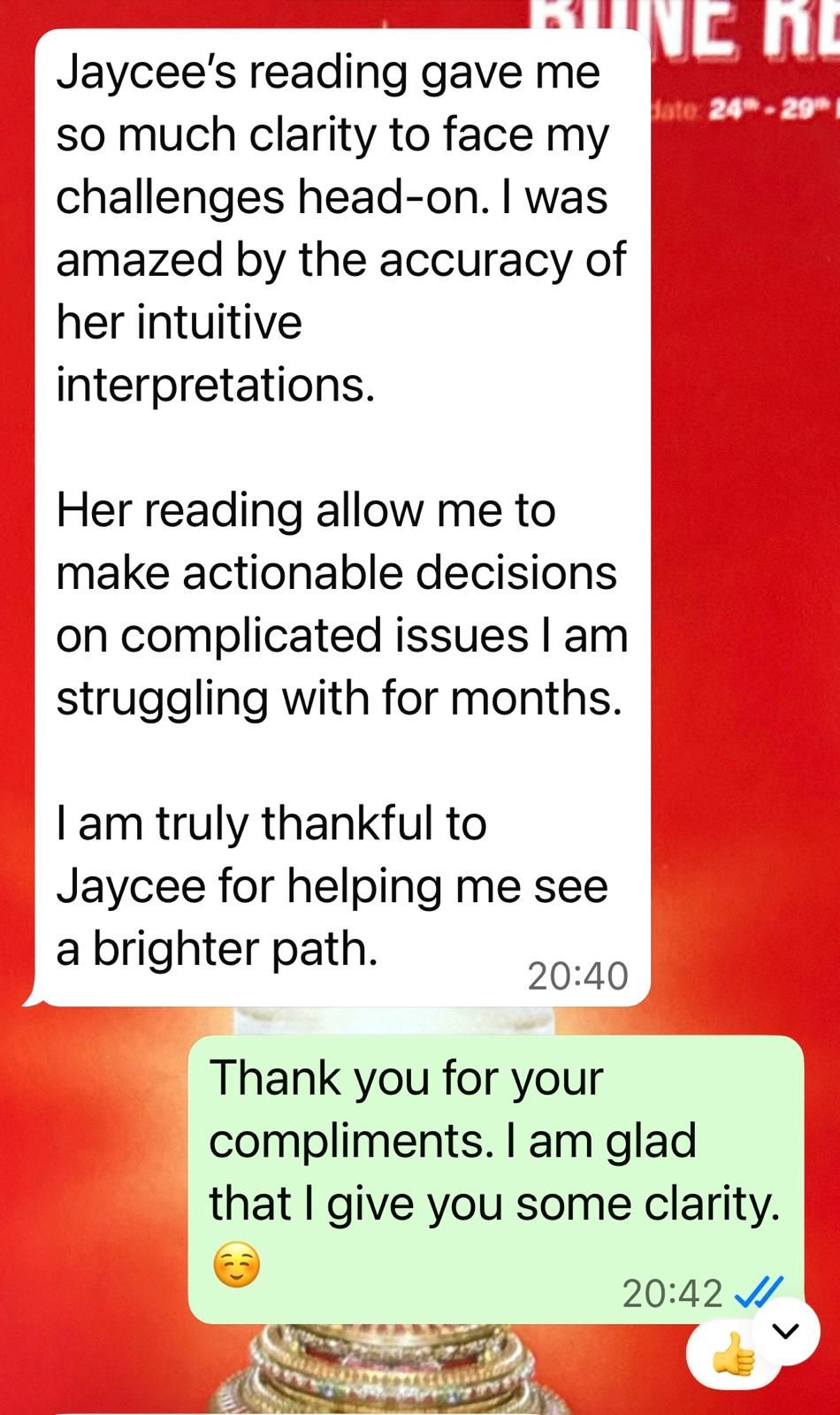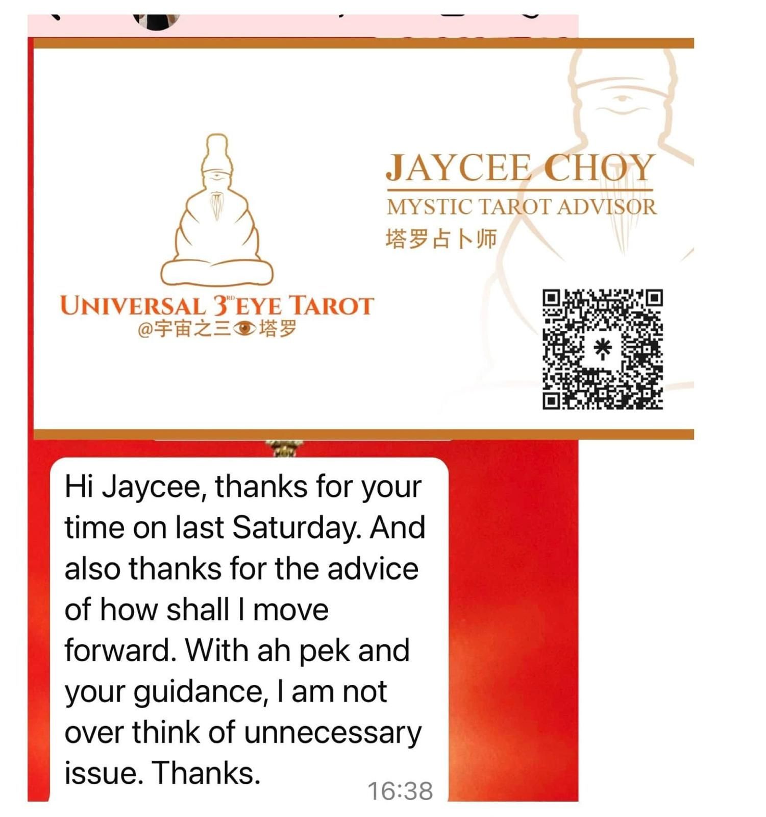 Trained under the respected Grand Master Ajann Sing, Jaycee has become a compassionate and intuitive tarot card reader. Combining traditional knowledge with personal touch, Jaycee supports clients through life's challenges, providing insights to their questions. Experience with the guidance of Jaycee with her Universal 3eye Tarot reading on your journey to greater understanding and peace of mind